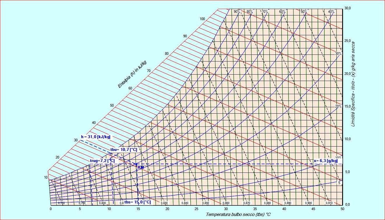 Dal grafico è possibile osservare che con una temperatura di 15°C e una umidità relativa del 60%, la temperatura di rugiada è di 7,2°C, mentre con una temperatura di 15°C e una umidità relativa U.R.= 80% la temperatura di rugiada è di 12°C.