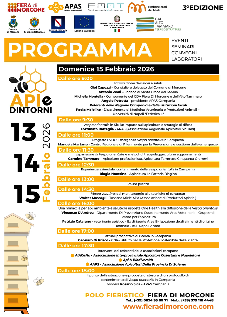 Dal 13 al 15 febbraio 2026, Morcone (BN) ospita API e Dintorni, manifestazione dedicata al mondo dell’apicoltura, ai prodotti dell’alveare e alle tematiche legate alla tutela delle api e della biodiversità.