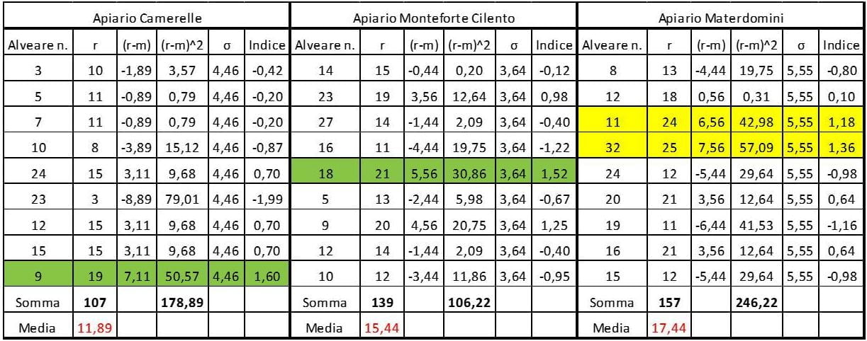 Per ottenere poi dati facilmente confrontabili tra alveari di apiari diversi bisogna calcolare un indice per ogni alveare di ogni singolo apiario. L’indice non è altro che la differenza di produzione di ogni singolo alveare e la media di tutto l’apiario rapportata alla deviazione standard dello stesso apiario.