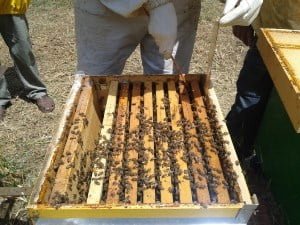 Un’occhiata può dirci la forza dell’alveare: se occupa 5 – 6 favi è forte abbastanza per questo momento. Alle volte sopra i favi non si vedono api perché sono ancora agglomerate nella parte dei favi sotto la fascia del miele, ma osservando vediamo buone famiglie.