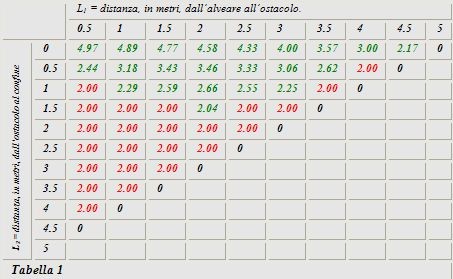 La tabella è formata da una prima riga, dove è indicata la distanza in metri dall’alveare all’ostacolo e da una prima colonna dove è indicata la distanza in metri dall’ostacolo al confine. Dall’intersezione di queste due variabili l1 e l2 si ricava l’altezza dell’ostacolo. I risultati in rosso sono i minimi imposti dalla legge n. 313/04, in verde sono quelli che sono stati calcolati e che tutelano maggiormente il confinante.