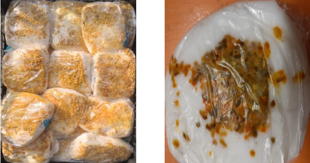 Dopo la befana inizio la nutrizione proteica stimolante la deposizione; nella foto il candito del commercio tagliato in porzioni da 200-300 grammi addizionato a polline proprio conservato in congelatore. Dopo pochi giorni di attivazione si può appoggiare in corrispondenza del foro sul coprifavo, che dev’essere in corrispondenza del glomere.